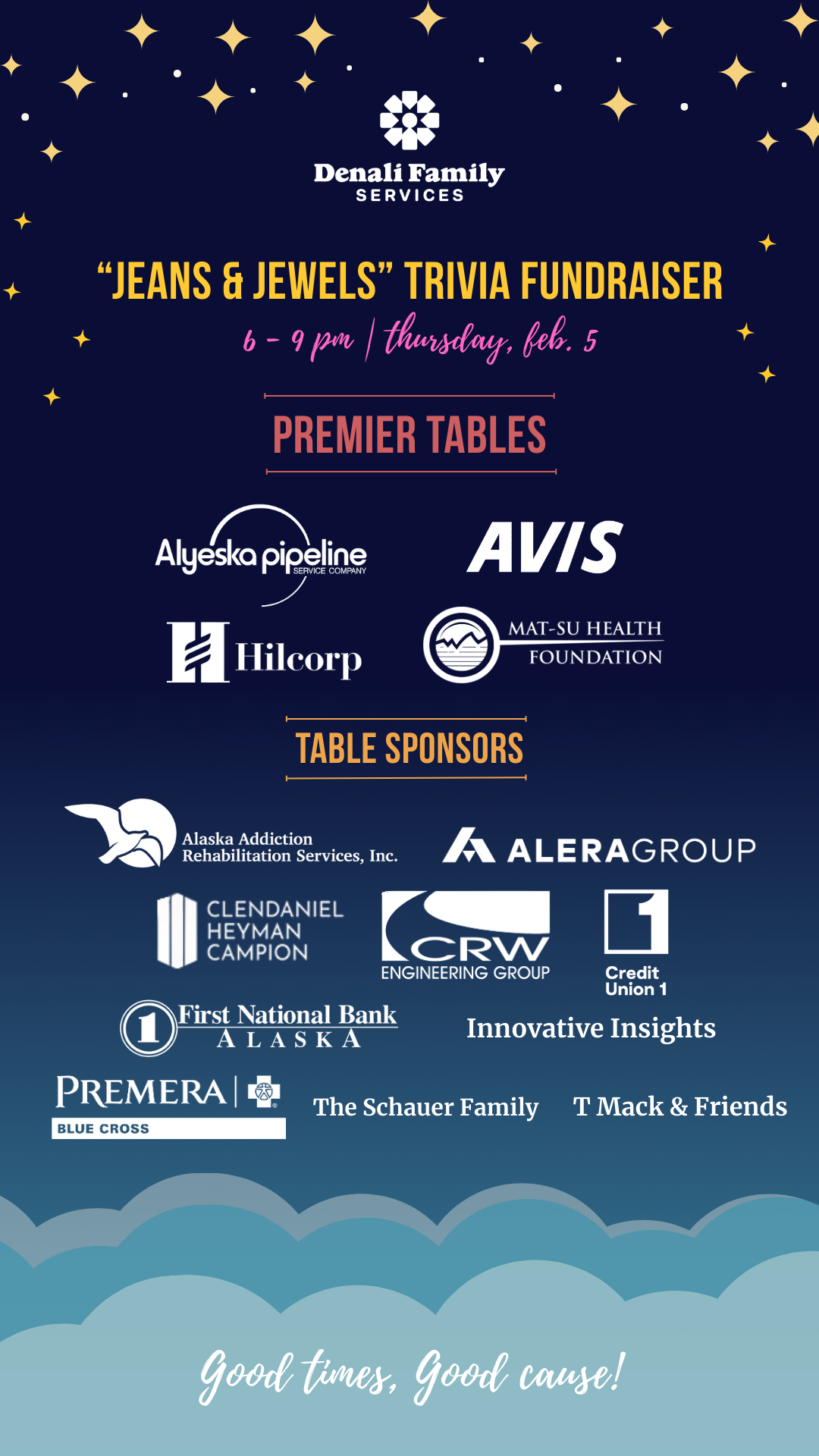 Every dollar raised at "Jeans & Jewels" directly supports DFS’ programs for youth living with behavioral health challenges in Anchorage and the Mat-Su Valley. These funds allow us to provide critical therapeutic services, keep youth connected to their communities, and ensure families have the support they need to thrive. By sponsoring this event, your business not only demonstrates a commitment to Alaska’s youth, but also partners with DFS to build stronger families and healthier communities for generations to come.